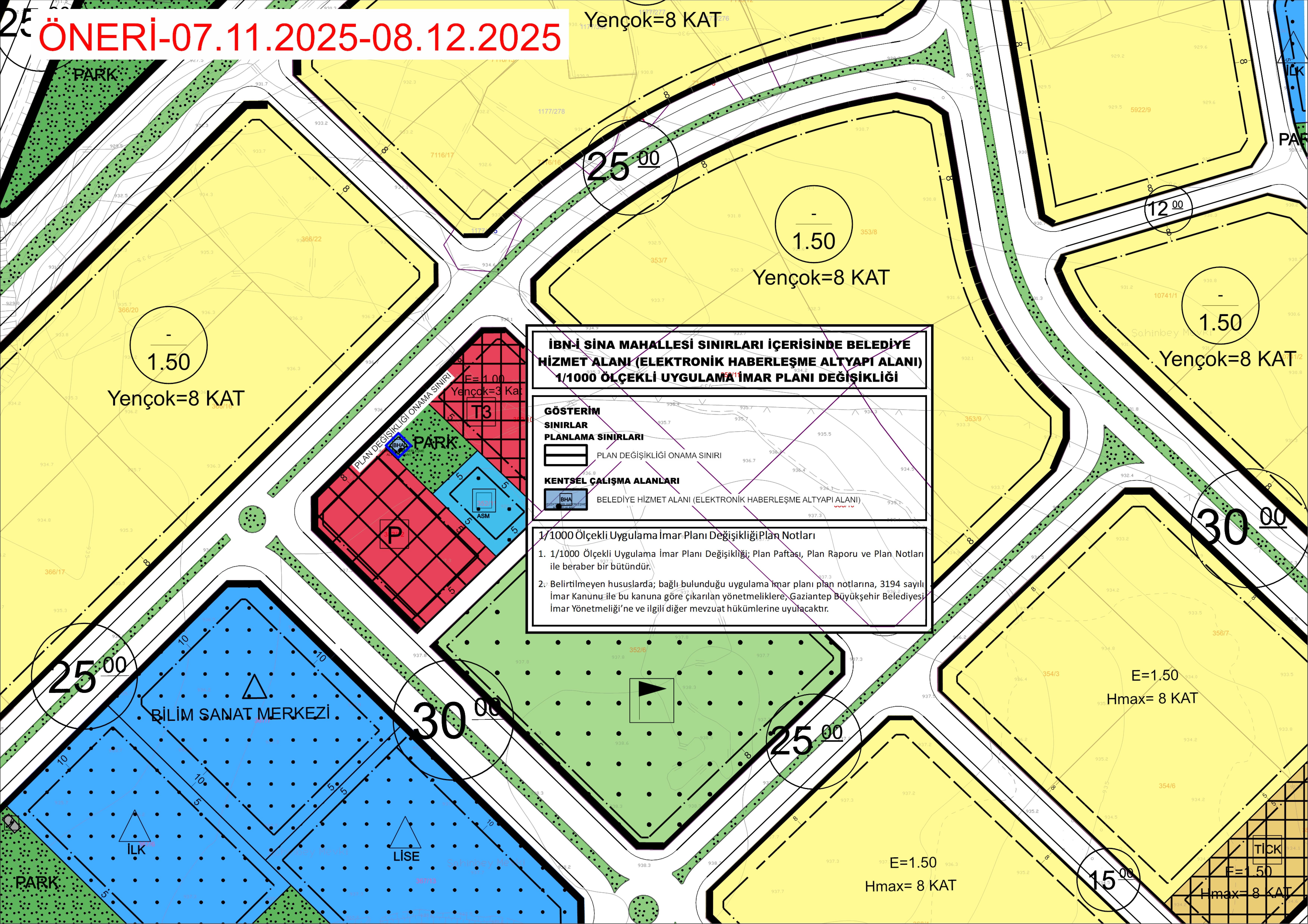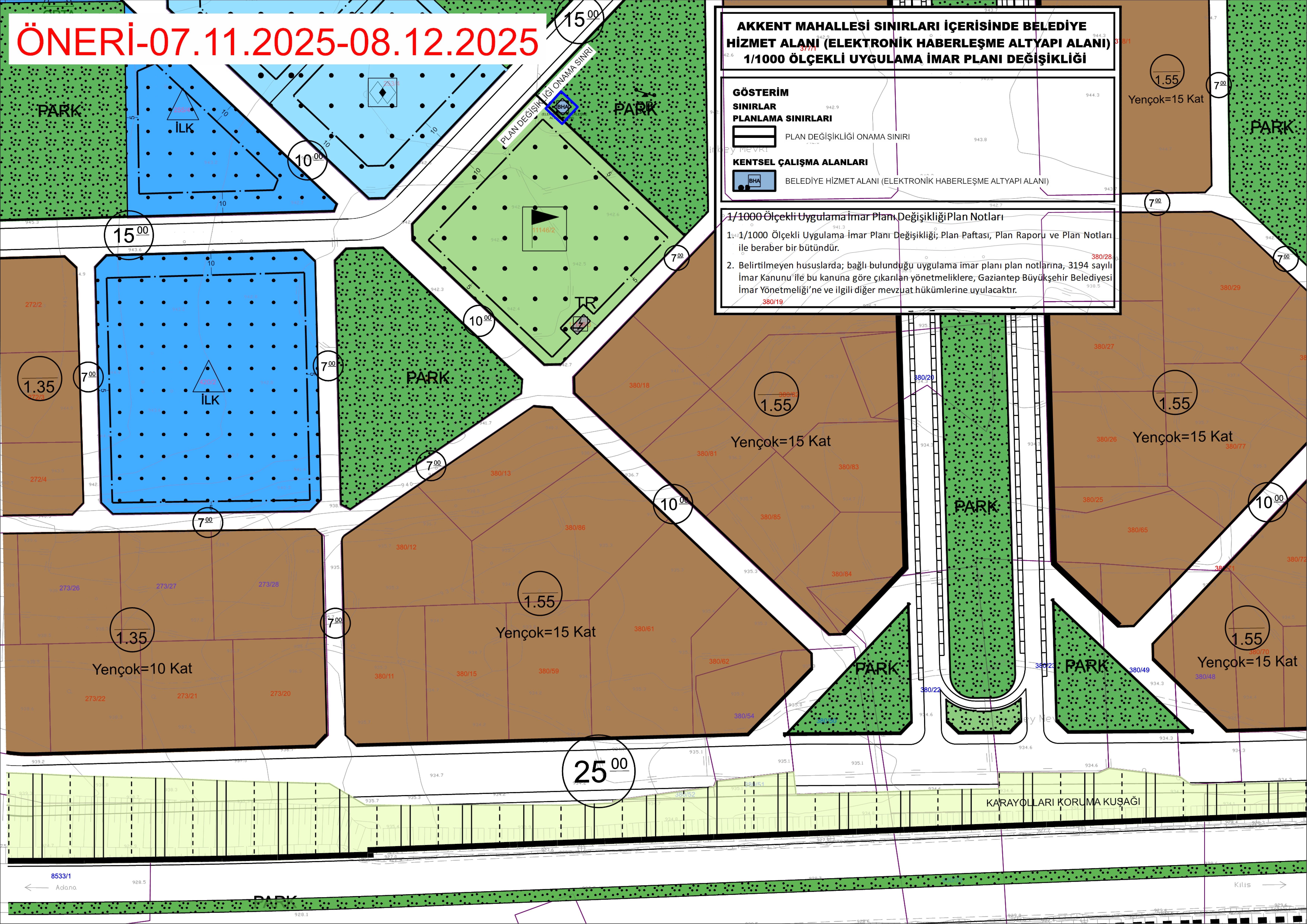 Belediye Meclisimizin 07.08.2025 tarih ve 102 sayılı kararı ile kabul edilen, Muhtelif Mahalle Sınırları İçerisinde Elektronik Haberleşme Altyapı Alanı 1/1000 Ölçekli Uygulama İmar Planı Değişikliği, Gaziantep Büyükşehir Belediye Meclisinin 11.09.2025 tarih 511 sayılı kararı ile onaylanmıştır.