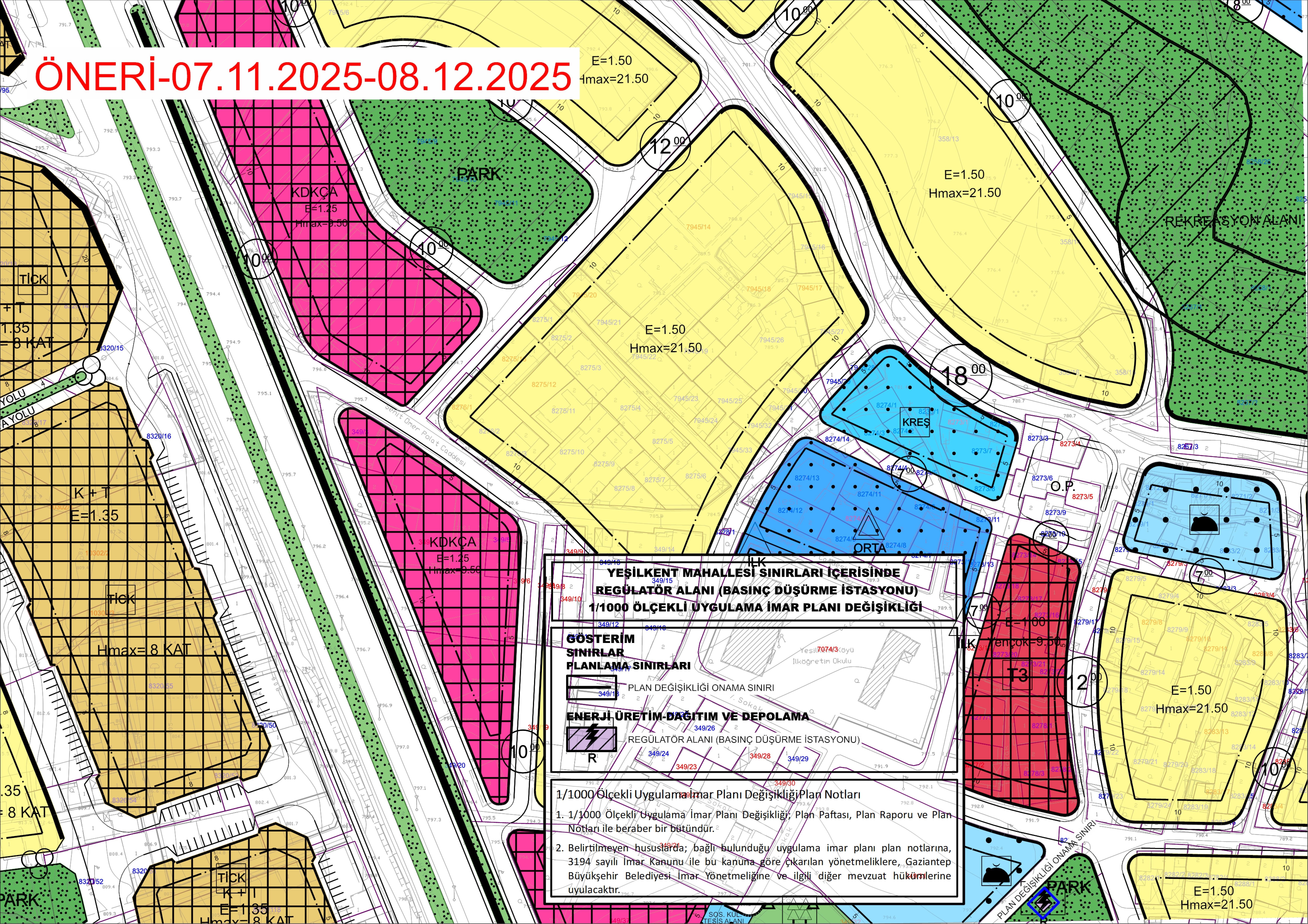 Belediye Meclisimizin 04.09.2025 tarih ve 107 sayılı kararı ile kabul edilen, Yeşilkent Mahallesi Sınırları İçerisinde Regülatör Alanı (Basınç Düşürme İstasyonu) 1/1000 Ölçekli Uygulama İmar Plan Değişikliği, Gaziantep Büyükşehir Belediye Meclisinin 16.10.2025 tarih 568 sayılı kararı ile onaylanmıştır.