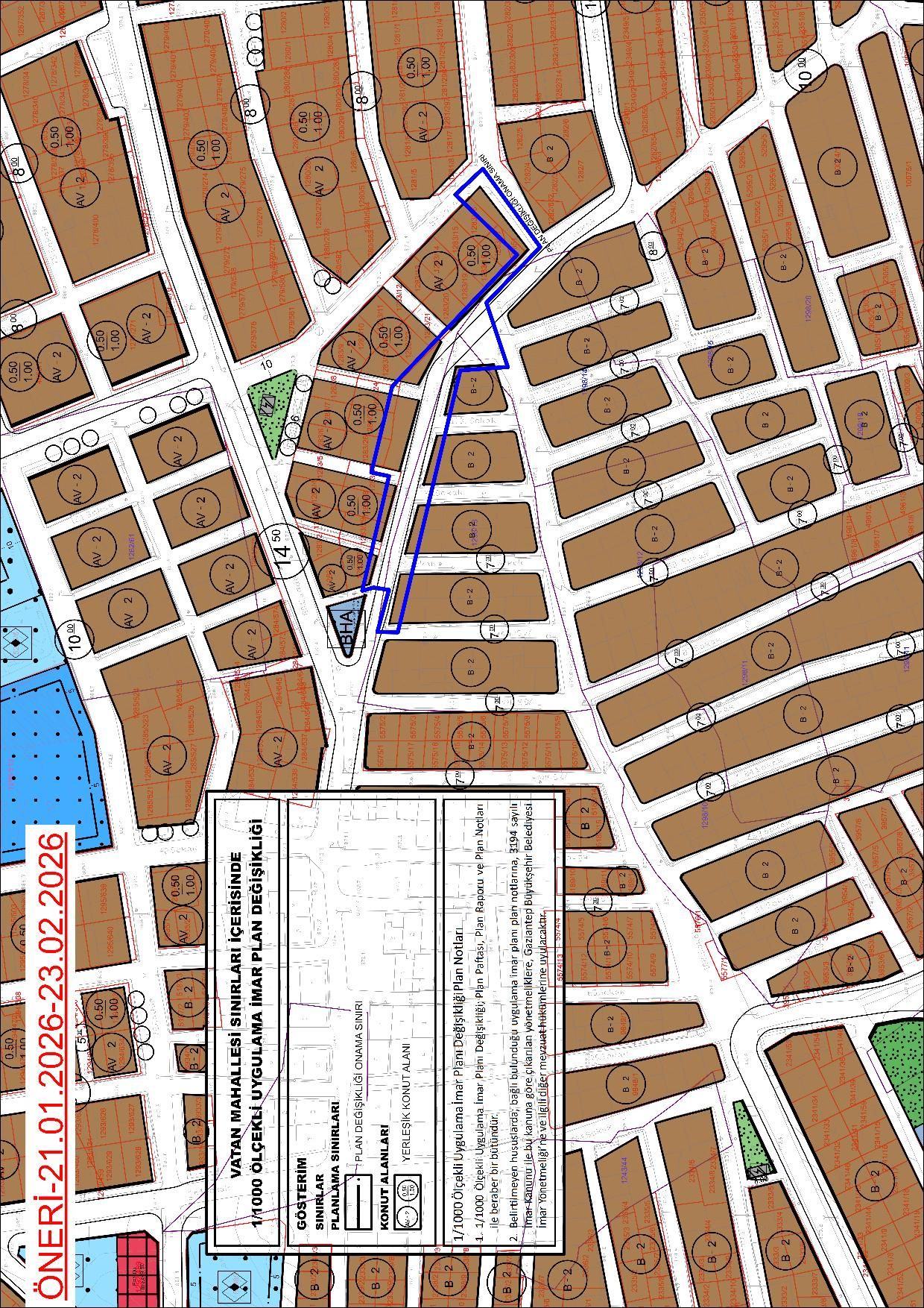 Belediye Meclisimizin 04.12.2025 tarih ve 144 sayılı kararı ile kabul edilen, Vatan Mahallesi sınırları içerisinde 1/1.000 ölçekli Uygulama İmar Plan Değişikliği, Gaziantep Büyükşehir Belediye Meclisinin 15.01.2026 tarih 65 sayılı kararı ile onaylanmıştır.