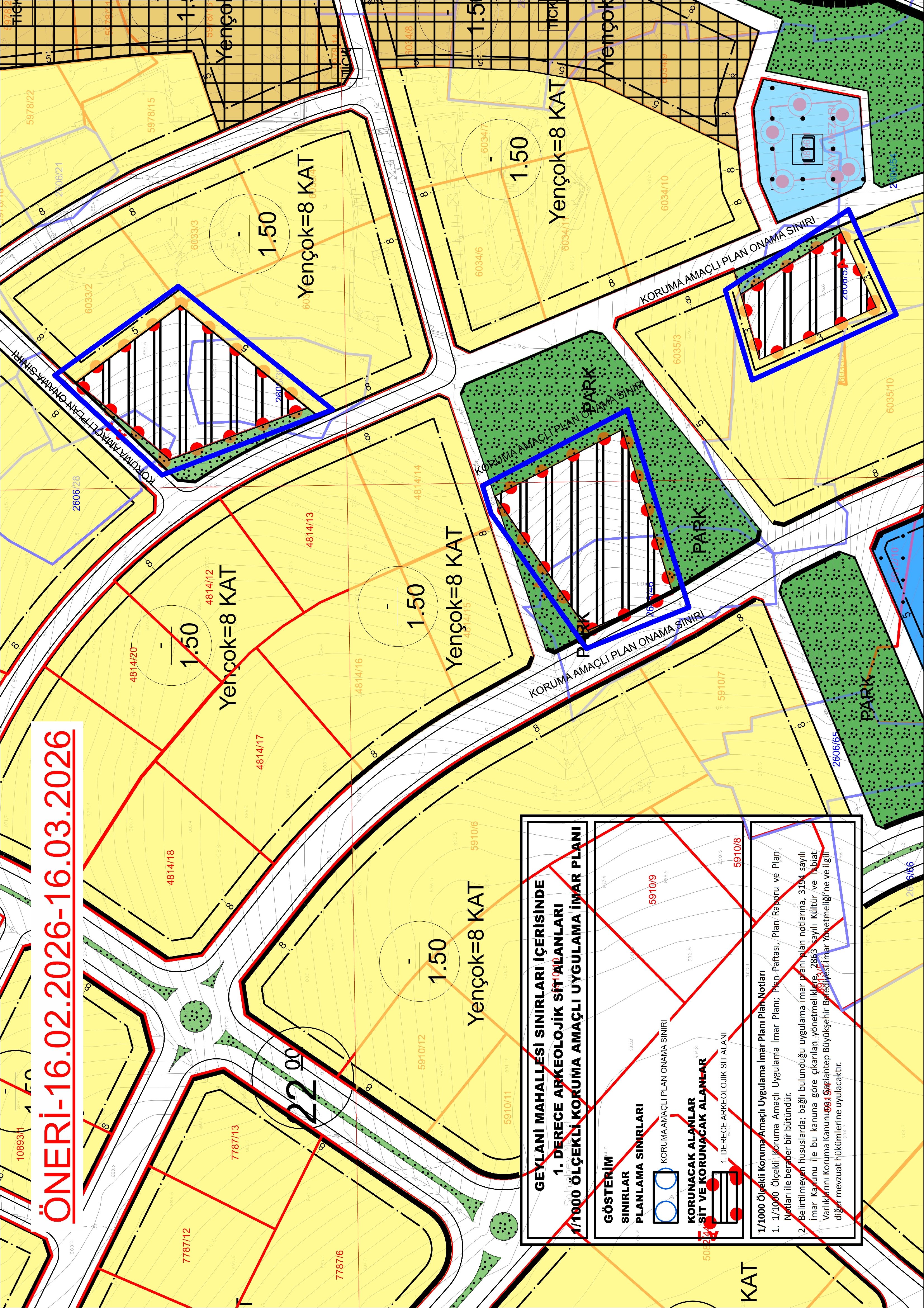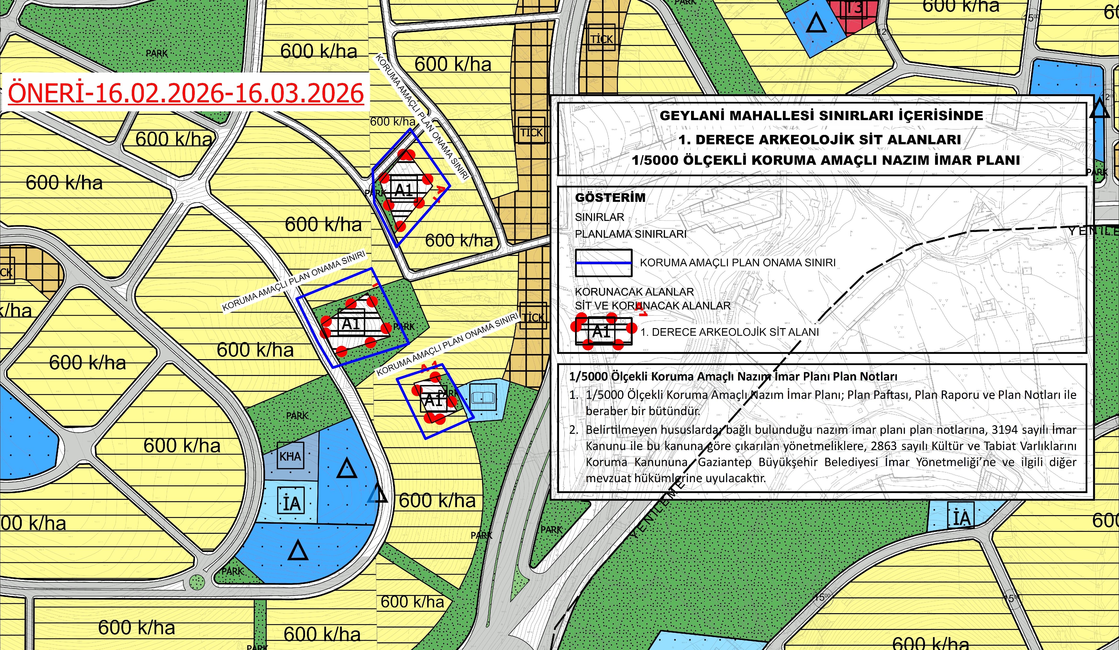 Çevre ve Şehircilik Bakanlığı Mekânsal Planlama Genel Müdürlüğünün 08.06.2018 tarih E.103381 sayılı yazısıyla Belediyemize verilen “Rezerv Yapı Alanı sınırları içerisinde her tür ve ölçekte imar planlarını hazırlama ve onaylama” yetkisi dâhilinde hazırlanan Geylani Mahallesi sınırları içerisinde 1. Derece Arkeolojik Sit Alanları 1/5.000 ölçekli Koruma Amaçlı Nazım İmar Planı ve 1/1.000 ölçekli Koruma Amaçlı Uygulama İmar Planı, Belediye Meclisimizin 05.02.2026 tarih 23 sayılı kararıyla onaylanmıştır.