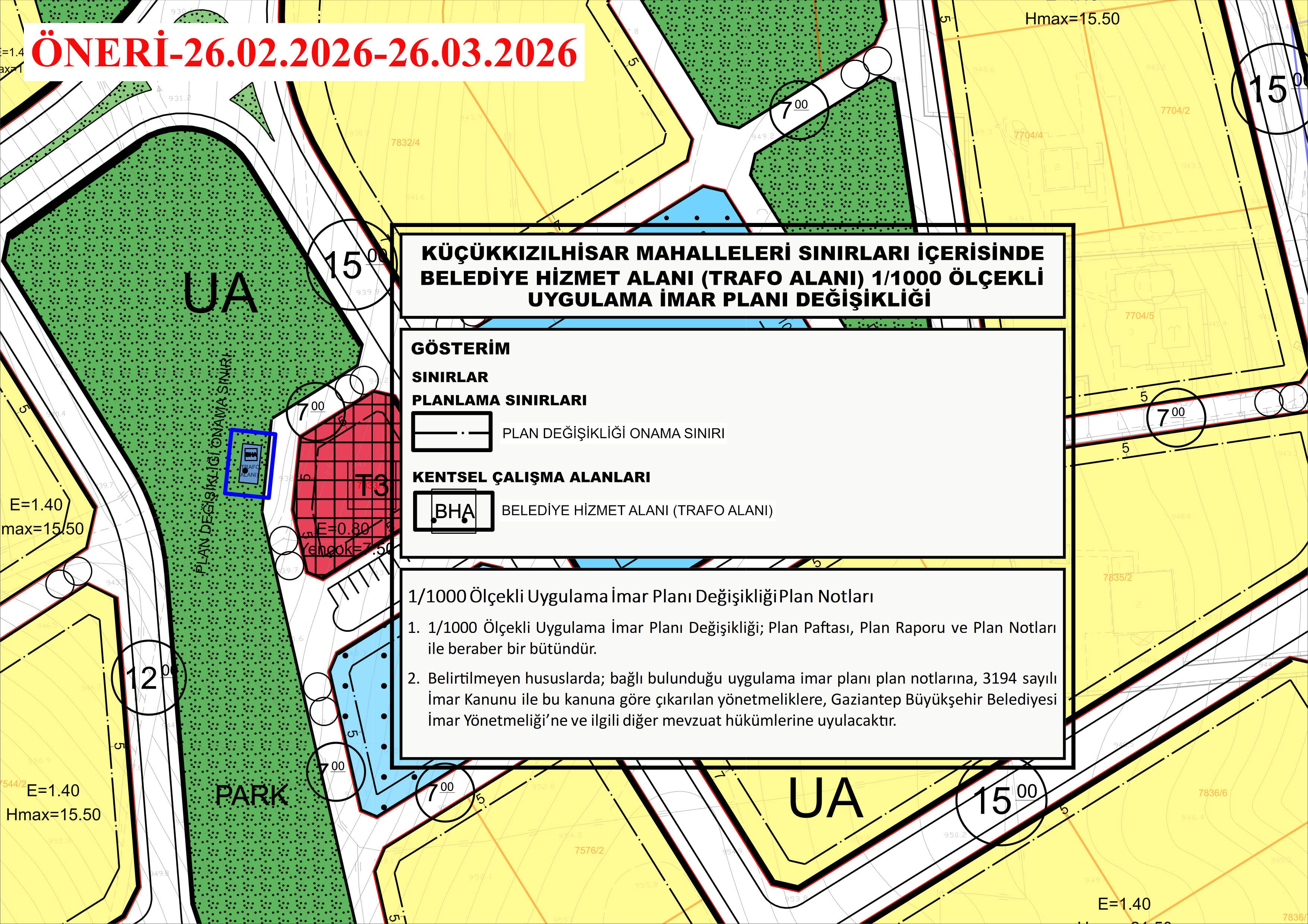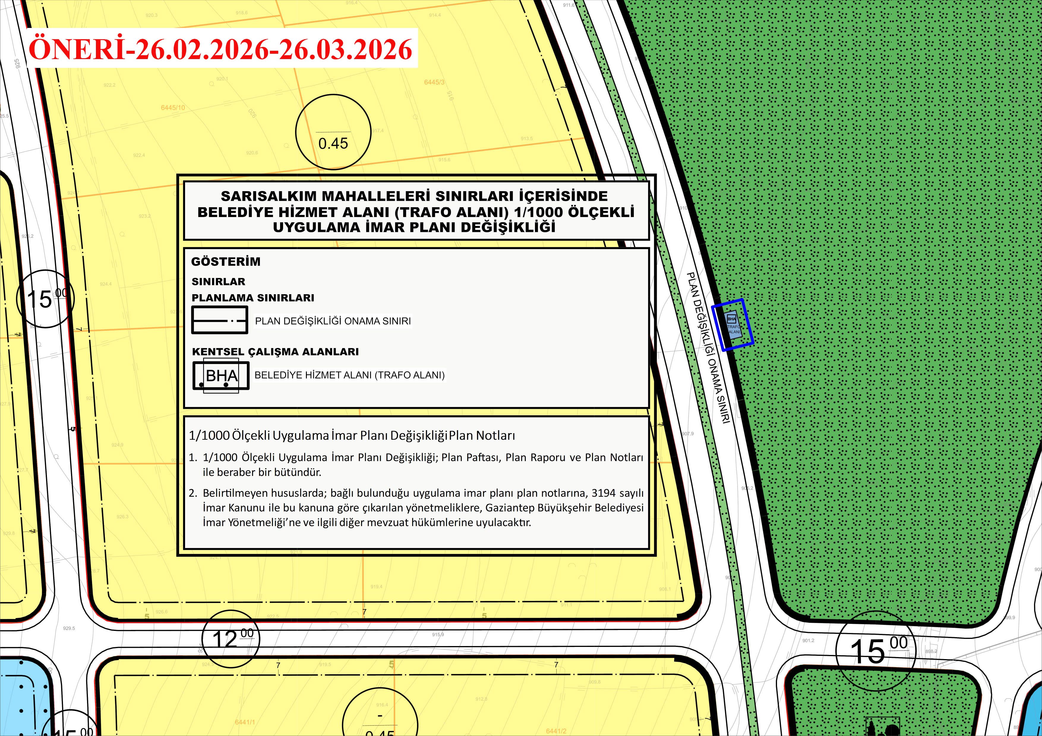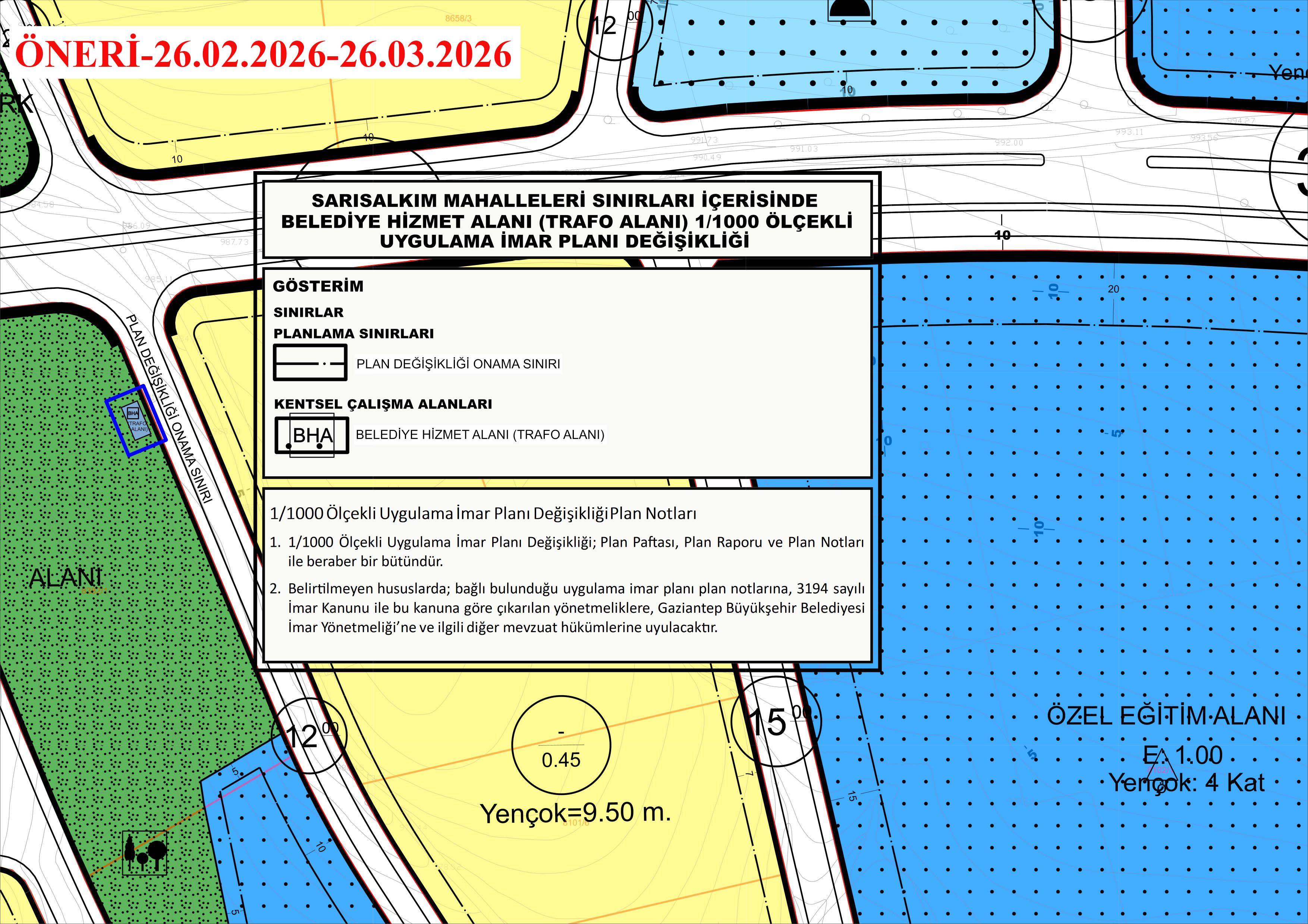 Belediye Meclisimizin 08.01.2026 tarih ve 4 sayılı kararı ile kabul edilen, İlçemiz Muhtelif Mahalleleri sınırları içerisinde Trafo Alanı 1/1.000 ölçekli Uygulama İmar Planı Değişikliği, Gaziantep Büyükşehir Belediye Meclisinin 12.02.2026 tarih 122 sayılı kararı ile onaylanmıştır.