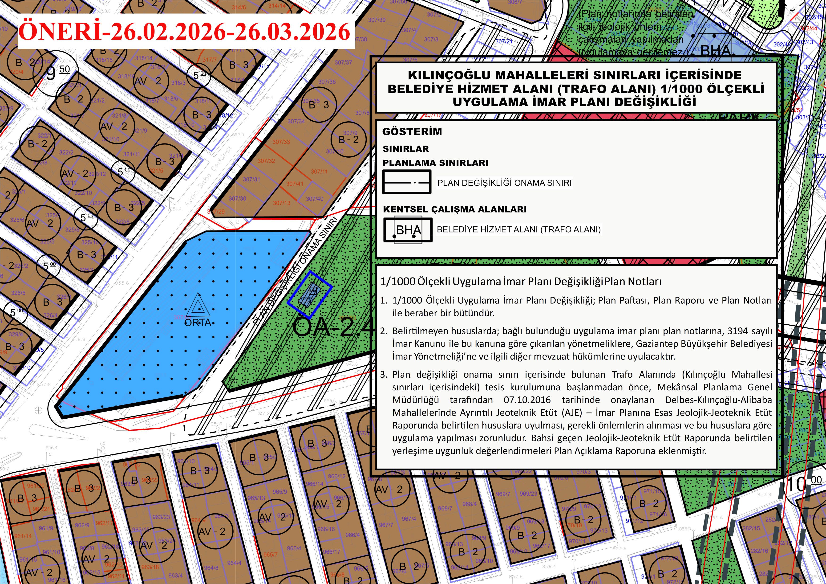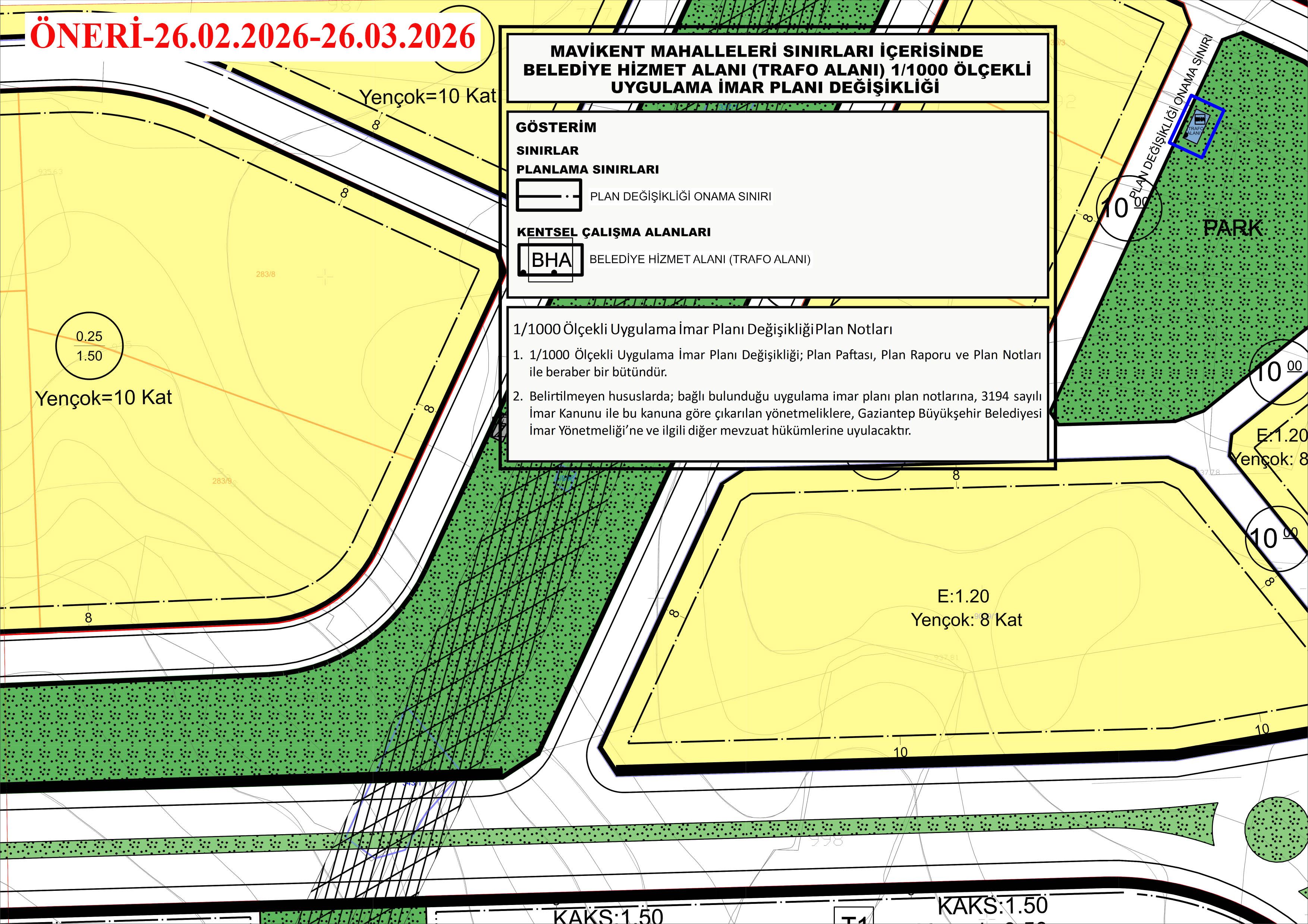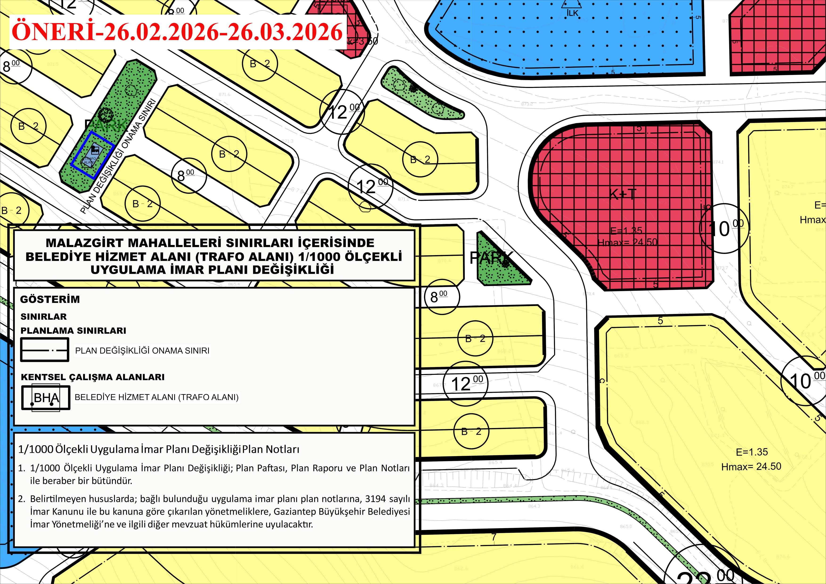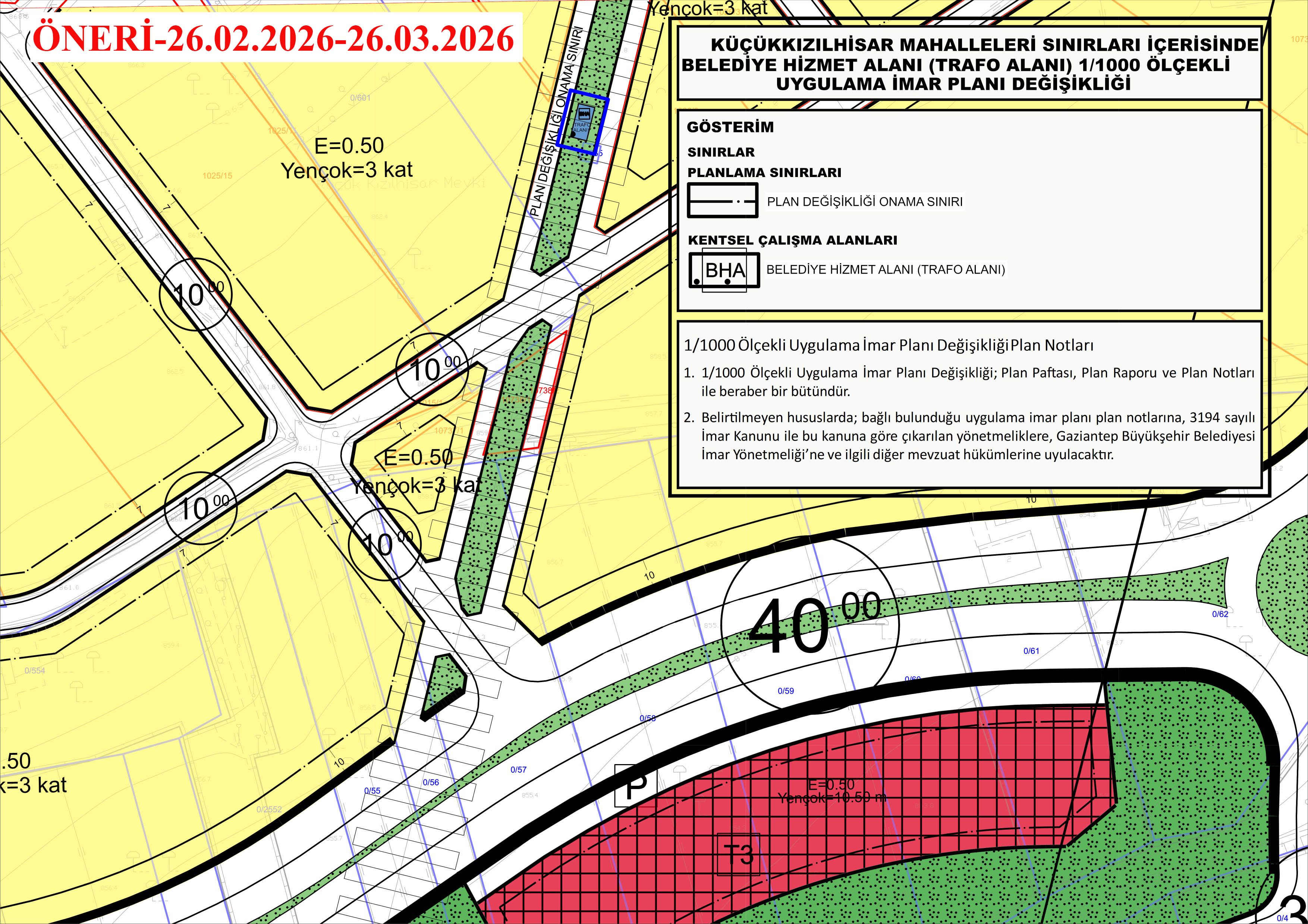 Belediye Meclisimizin 08.01.2026 tarih ve 4 sayılı kararı ile kabul edilen, İlçemiz Muhtelif Mahalleleri sınırları içerisinde Trafo Alanı 1/1.000 ölçekli Uygulama İmar Planı Değişikliği, Gaziantep Büyükşehir Belediye Meclisinin 12.02.2026 tarih 122 sayılı kararı ile onaylanmıştır.