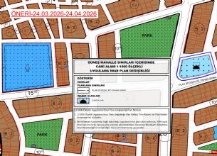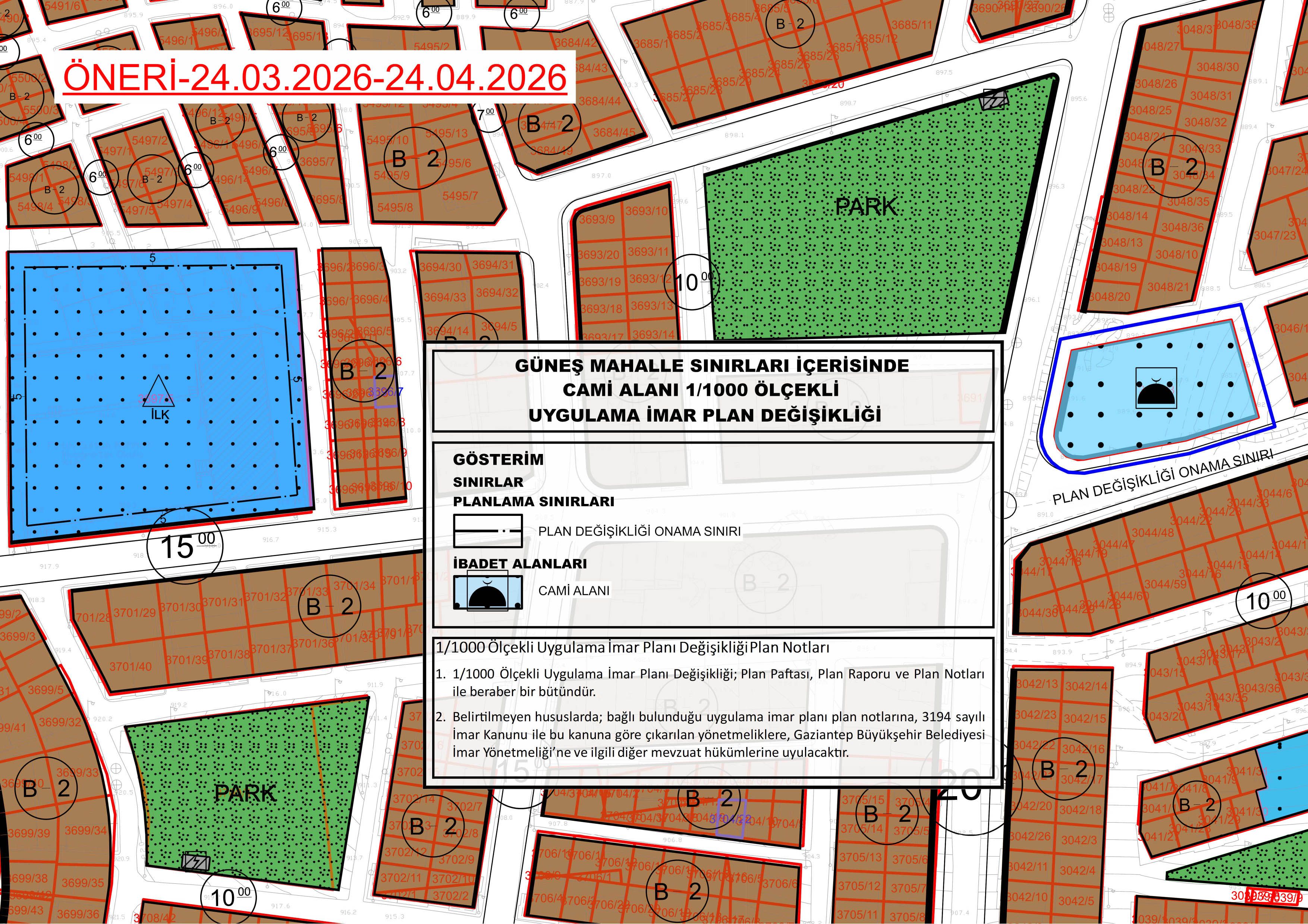 Belediye Meclisimizin 05.02.2026 tarih ve 22 sayılı kararı ile kabul edilen, Güneş Mahallesi sınırları içerisinde Cami Alanı 1/1.000 ölçekli Uygulama İmar Planı Değişikliği, Gaziantep Büyükşehir Belediye Meclisinin 12.03.2026 tarih 183 sayılı kararı ile onaylanmıştır.