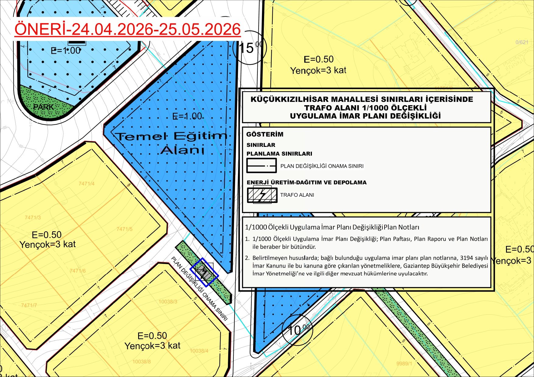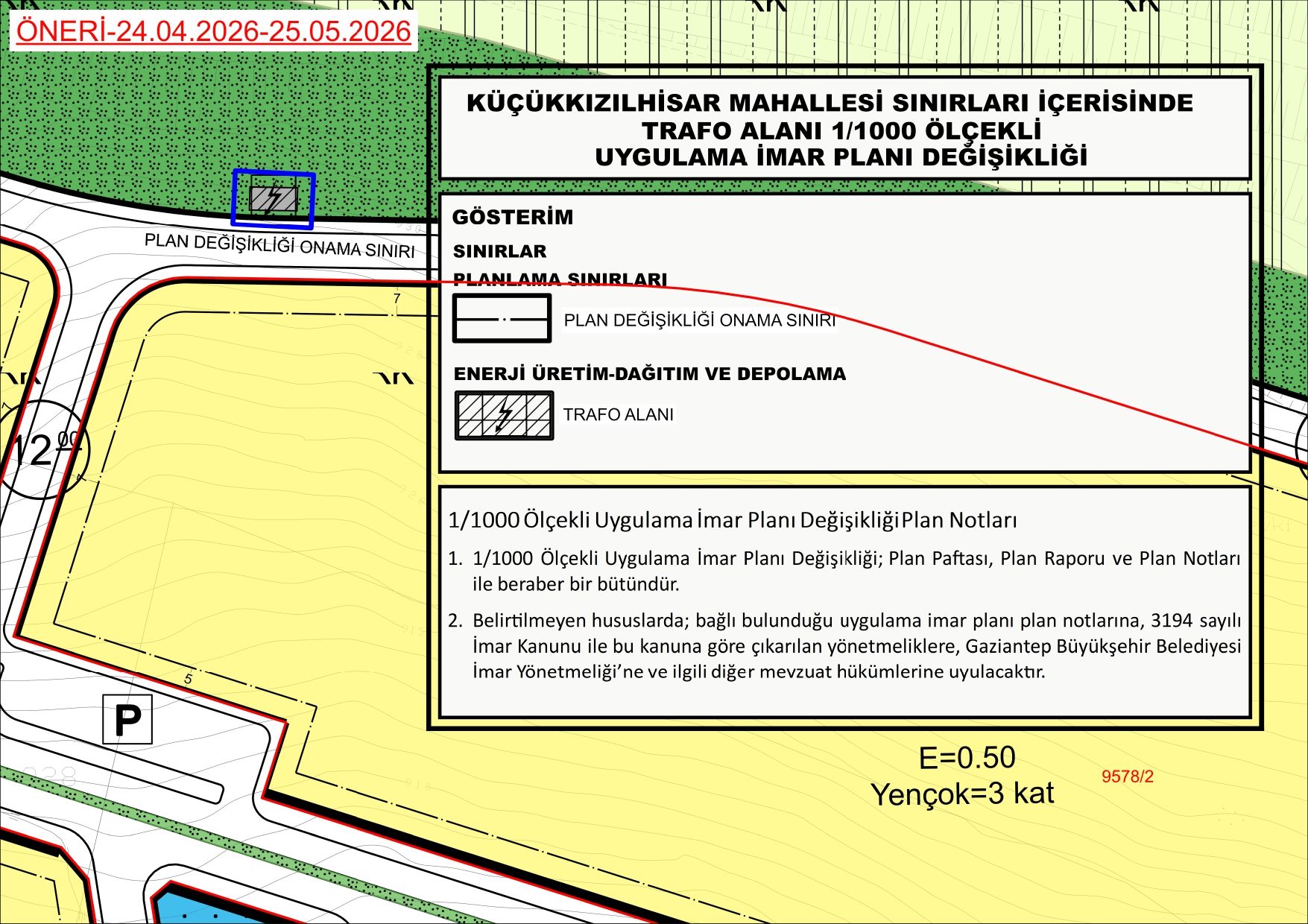 Belediye Meclisimizin 05.03.2026 tarih ve 31 sayılı kararı ile kabul edilen, İlçemiz Muhtelif Mahalleleri sınırları içerisinde Trafo Alanı 1/1.000 ölçekli Uygulama İmar Planı Değişikliği, Gaziantep Büyükşehir Belediye Meclisinin 16.04.2026 tarih 263 sayılı kararı ile onaylanmıştır.