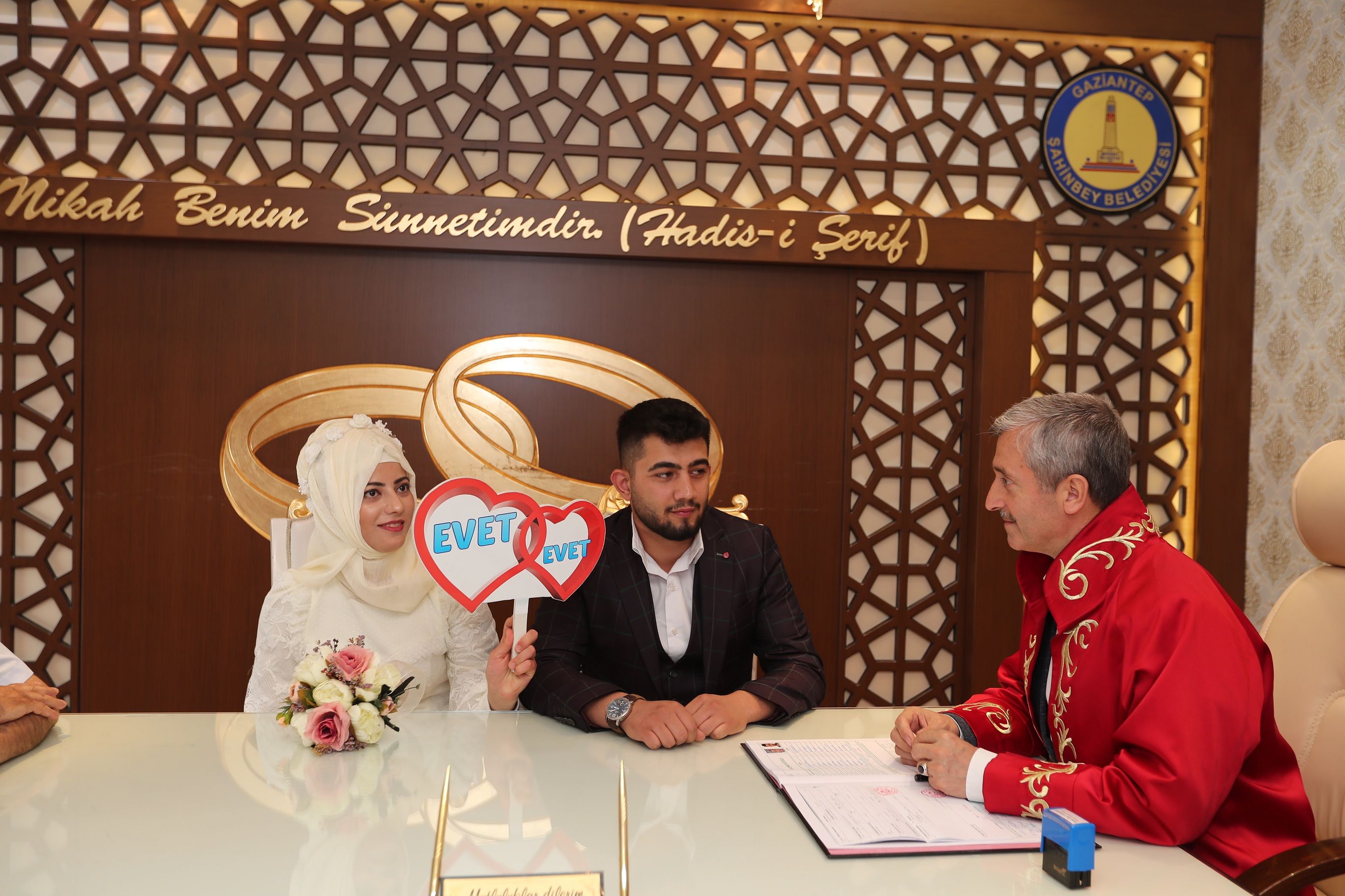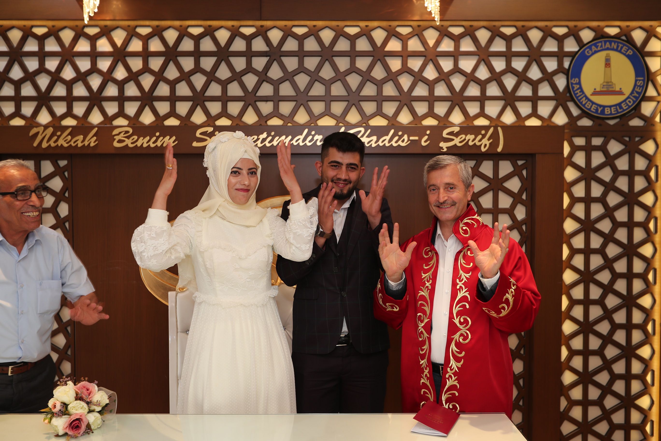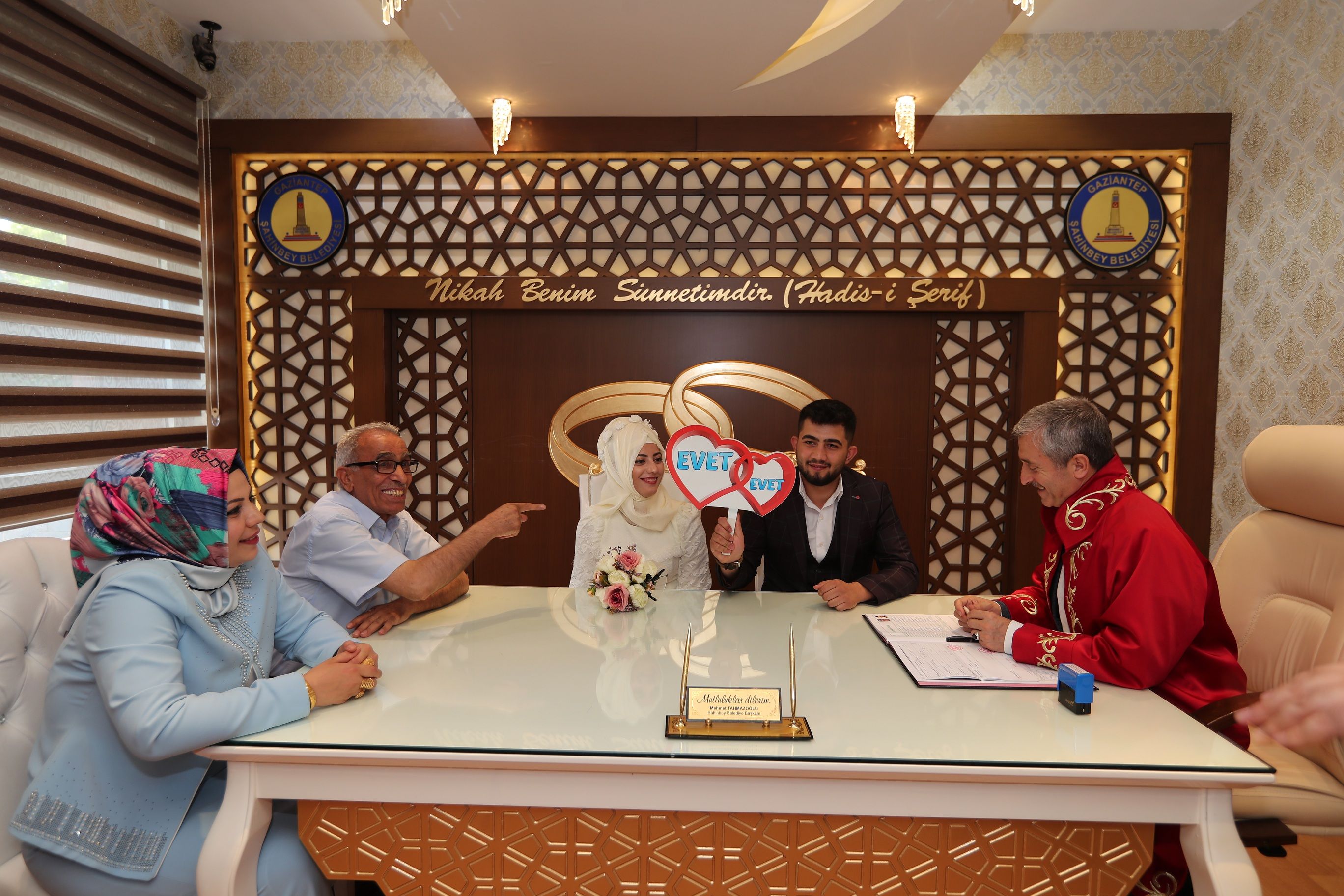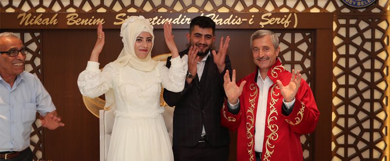 Son yıllarda Türkiye'nin en çok nikah kıyılan ilçesi olan Şahinbey Belediyemizde nikah kıyımı tüm hızıyla devam ediyor. Şahinbey Belediye Başkanımız Mehmet Tahmazoğlu, Şahinbey Belediyesi Evlendirme Memurluğunda nikah kıymak için gelen çiftleri ziyaret edip hayırlı olsun temennisinde bulunarak çiftlerin nikahını kıydı.