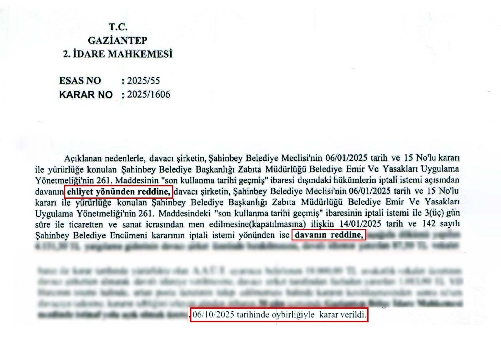 Şahinbey Belediyesi tarafından daha önce 3 gün süreyle kapatılan MİGROS marketin itirazında mahkeme, Şahinbey Belediyesi’nin uygulamasını kanuna ve hukuka uygun buldu; Mahkeme Şahinbey Belediyesi’nin haklı olduğuna oy birliğiyle karar verip kapatma kararının doğruluğunu tescilledi.