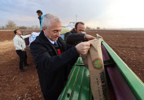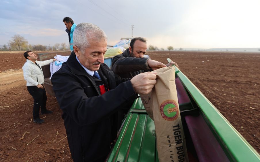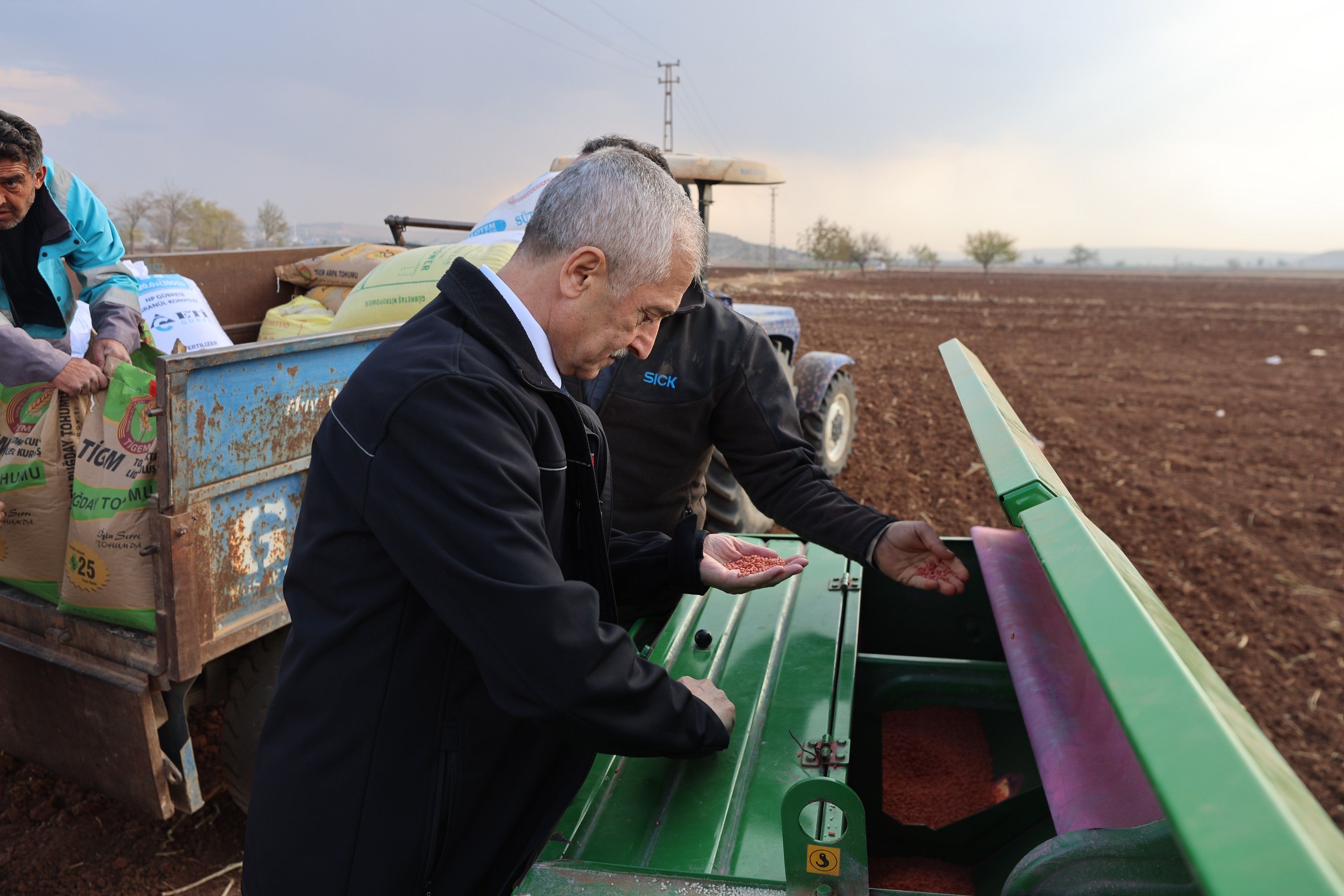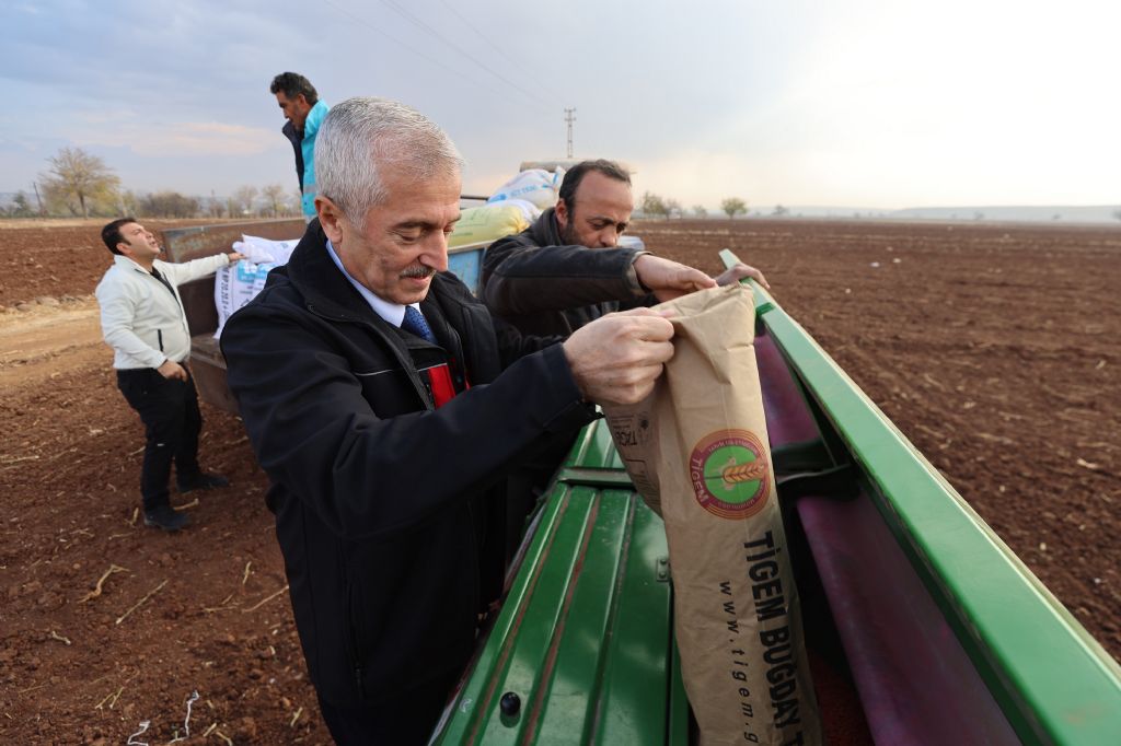 Belediye Başkanımız Mehmet Tahmazoğlu, çiftçilerin desteklenmesi için dağıttığı buğday tohumunu ve gübreyi çiftçilerle birlikte toprakla buluşturdu.